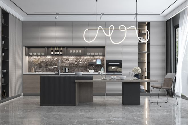 全铝板式家具,以简约而不简单的现代轻奢设计,给居住者的生活带来舒心温暖的体验。开放式厨房采用岛台一体化的设计,这种设计对空间的利用更加细节化。厨房、厨电、餐厅三线一体。隐藏式拉手,使用方便而不失质感,满足厨具餐具物品随取随放的使用需求。